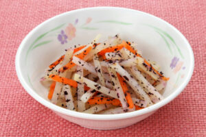 ①じゃがいもと人参は千切りにし、さっとゆでて水気を切る。